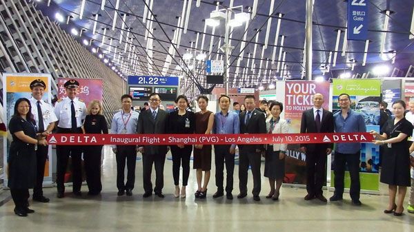 中国名品时尚网综合报道:美国达美航空公司(纽约证券交易所股票代码:DAL)7月10日(周五)正式开通了上海浦东国际机场往返于洛杉矶国际机场间的每日直航服务。当晚,达美航空在浦东机场登机口举行了隆重的首航剪彩仪式,随后航班准时起飞。首班由上海飞往洛杉矶的航班载客率达到100%。