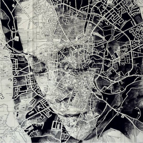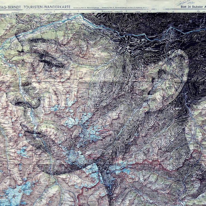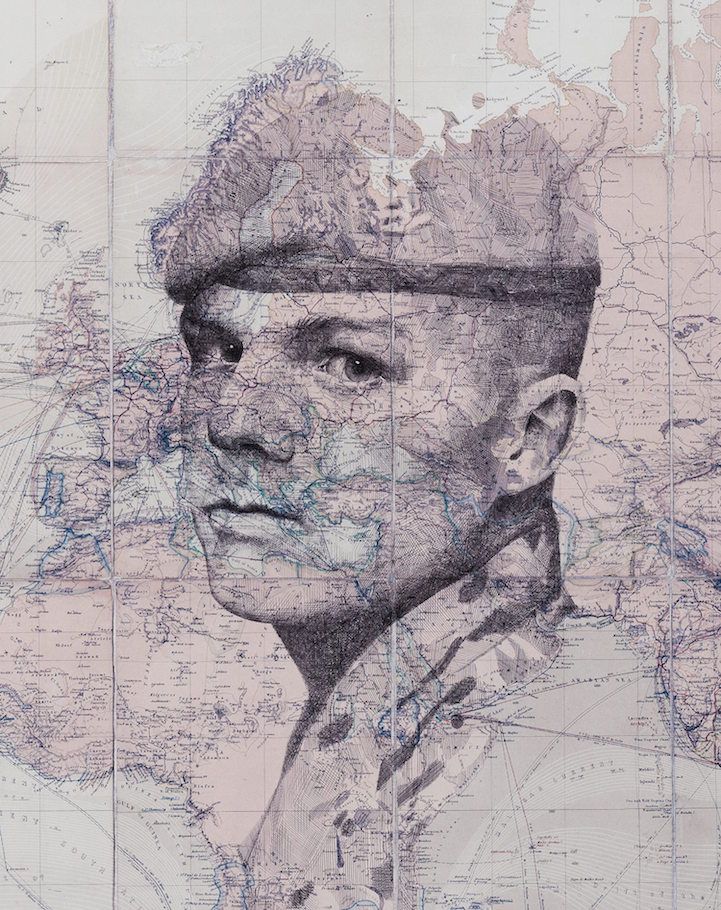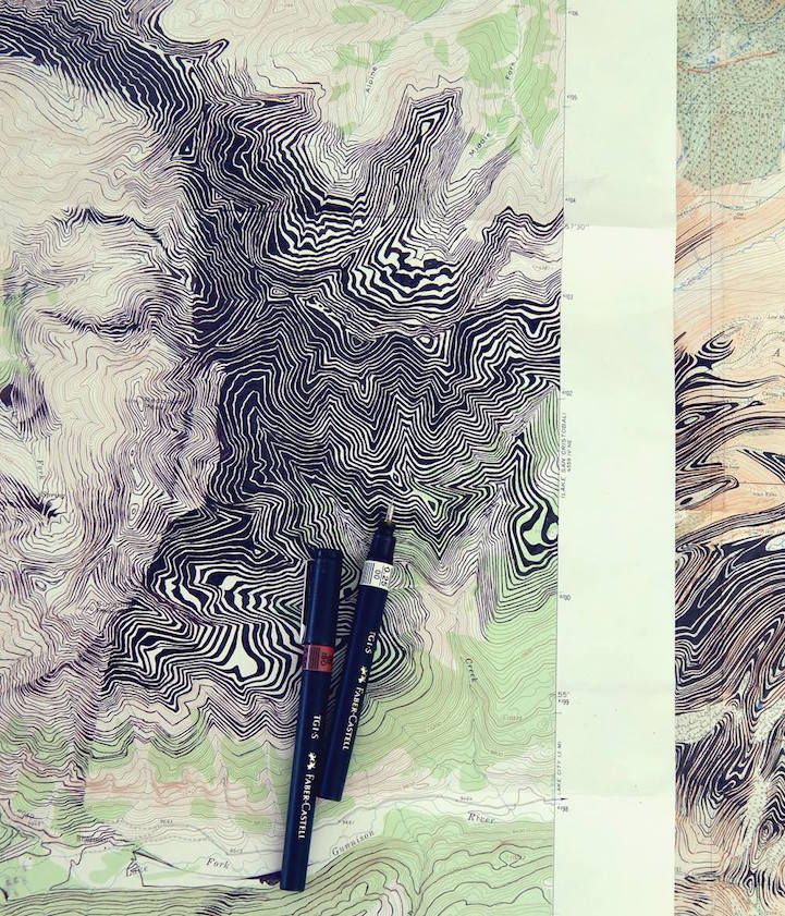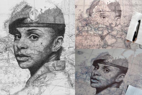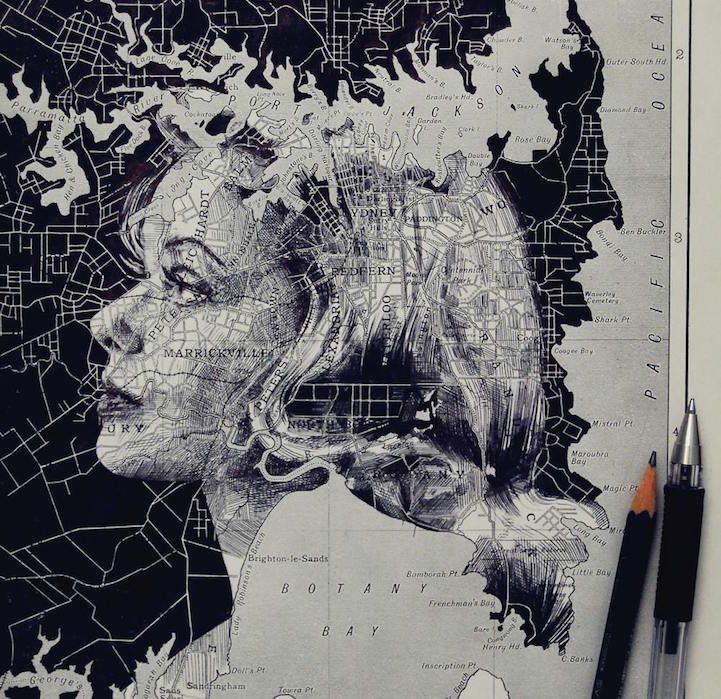英国艺术家艾德费尔本使用地图作为他的画布惊人的墨水和铅笔肖像。脸是由轮廓碎片的轮廓,不仅划定边界,道路和地理特征,但也有惊人的相似之处,纹理和皮肤。由令人难以置信的错综复杂的细节组成,从密集的线条中出现的人的形式是非常现实的,即使在被地图的模式中抽象出来。 当问到他为什么使用地图作为他选择的介质,费尔说:“在他的facebook页面的几个原因…短命的品质,传统元素的远离,图案的丰富性…地图提供了一种框架,适合我的工作,无论是在物理和概念上。”