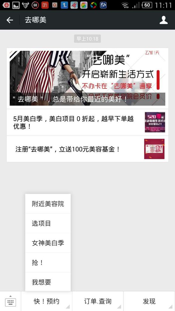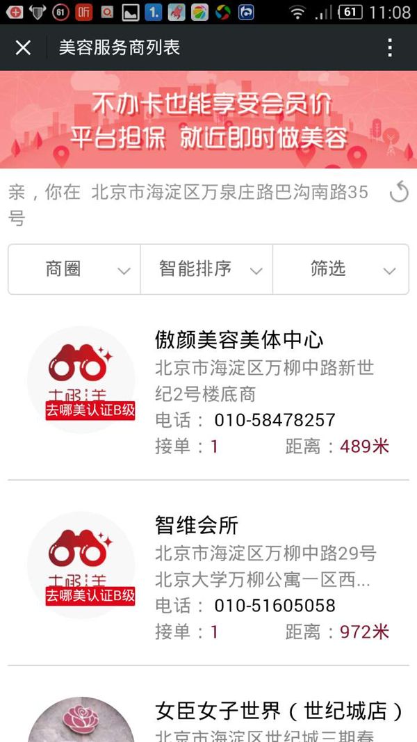 进入“去哪美”微信公众平台,可以看到功能栏中的快预约,订单.查询和发现。点击快预约功能中的附近的美容院,进入美容服务商列表,系统会根据用户的位置,将美容院按照由近到远自动排序。用户也可以进行手动筛选,选择想去的商圈,并且在智能排序中选择口碑最优的商家。
