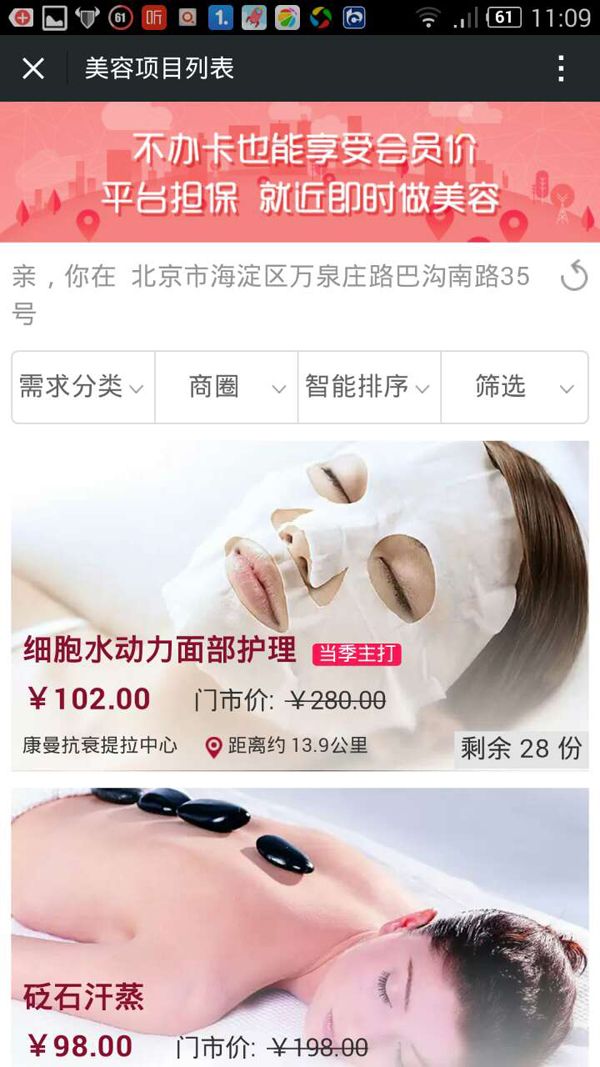 5月20日,“去哪美”美容O2O平台正式上线。平台整合北京优质美容院资源,包含三里屯,望京,中关村等28个商圈,实现对全北京的地毯式覆盖。用户可以直接在平台上根据需求选择离自己最近的美容院,预约服务,并享受平台专属优惠。