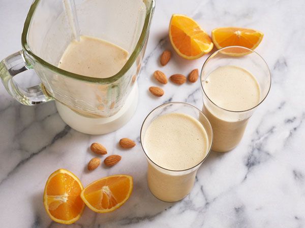 混合橙汁和枣于可置于微波炉的杯子中,并将微波调至高档,加热15秒。将混合物与其他成分一起置于搅拌器中,将搅拌器调至高档,搅拌直至成泥。品尝并调整口味。将饮品置于冰箱中冷藏2小时或一晚,也可以立刻品尝。若冷藏饮品,请在食用前再次搅拌。