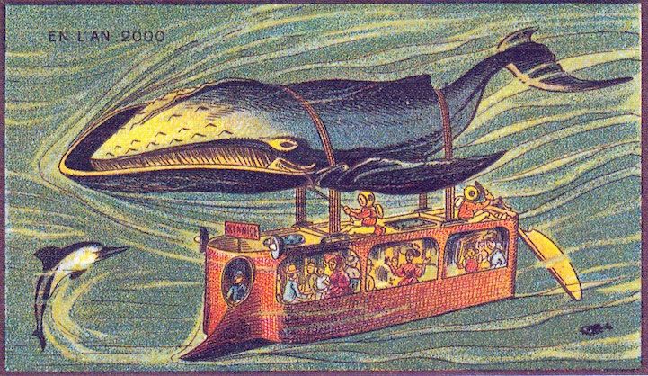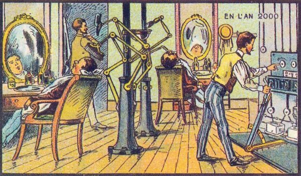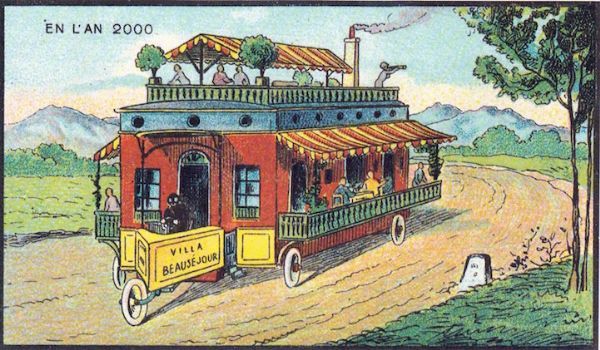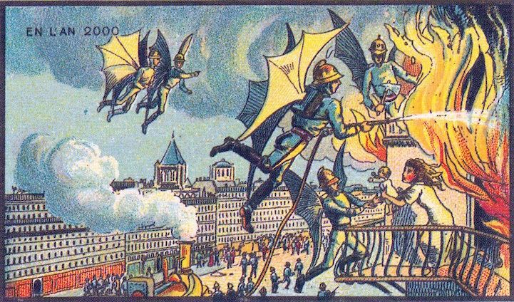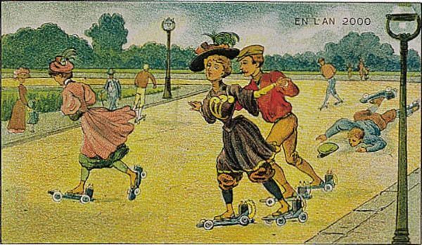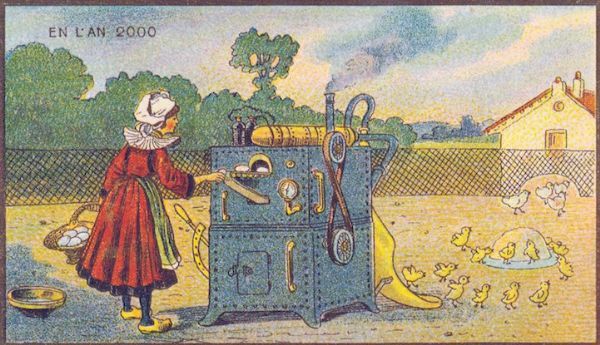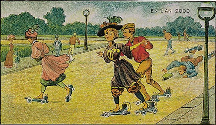 虽然当时的插图是远远不够的,但这一概念并不是很遥远,从今天的现实中。有些场景包括先进的技术手段,比如制造衣服、扫地、收割农场。提供邮件和扑灭火灾的预测是在半空中完成的。他们甚至有电动滚筒溜冰鞋和滚动的房子。