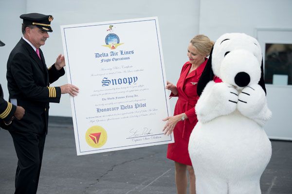达美航空向世界著名的王牌飞行员史努比授予了“达美航空荣誉飞行员”的称号