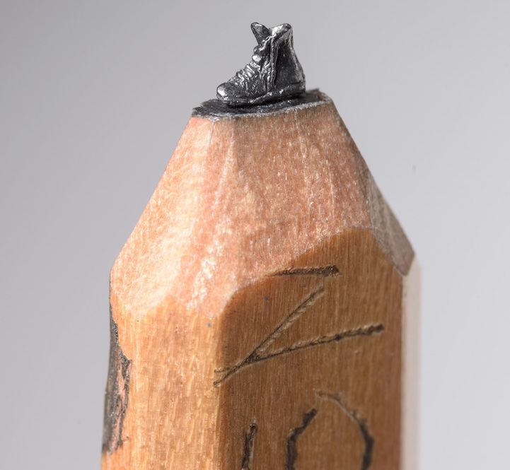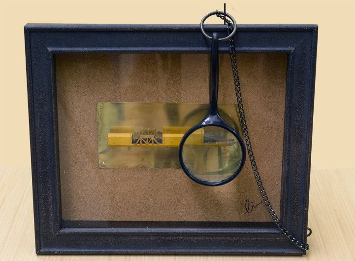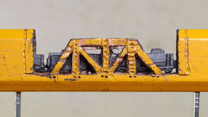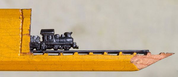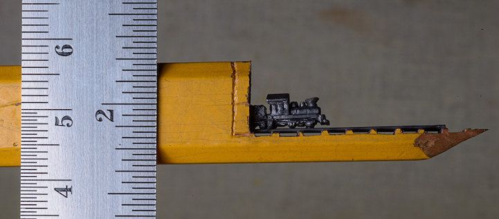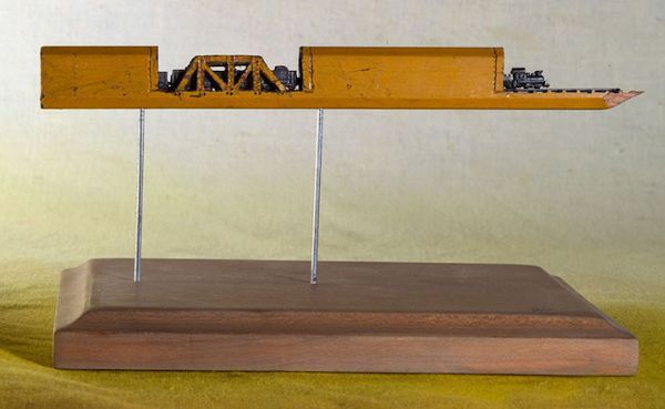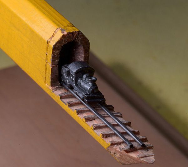 用一个放大镜和美工刀,艺术家辛蒂Chinn用铅笔雕刻了一个小小的火车。微型件小于一英寸和5.5英寸长,雕刻出来的火车快速地穿过黑暗的隧道部分。外部的木壳扮演片中不可或缺的一部分,作为一个景观可堪比中国的石匠工艺。 由于这个特殊的尺寸,艺术家用放大镜将她的雕塑品卖出去,观众不会错过任何令人难以置信的细节。目前通过出售中国Etsy商店。