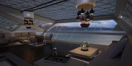 游艇的设计者为 Dune 90 游艇设计了空前宏大的“透视”效果,拥有极佳的视野及采光效果,而游艇的上层覆盖了一层玻璃中庭,以散去不必要的热量。此外,在游艇的主甲板的前方还设有一个游泳池。