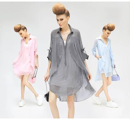 而中长款条纹衬衫款女雪纺连衣裙夏DS430,深V设计在视觉上将身材变得更加纤细,袖身可调节抽绳,能轻松调节袖子长短,及时应对气温变化。中长款A字版型,包容性非常好,假两件的效果,衣摆飘逸,层次分明。