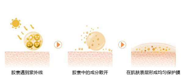 HERA阳光伴靓户外防晒霜能做到强力的防护,得益于其独家开发的皮肤网状保护第2代复合成分。防晒霜中含有无数微小胶囊,在遇到紫外线的瞬间就能在肌肤表层释放出β-胡萝卜素、维生素E等成分,并铺展开形成细密均匀的保护膜,防晒紫外线防止肌肤老化的同时,还含有抗皱营养成分,做到了防晒保养兼顾。
