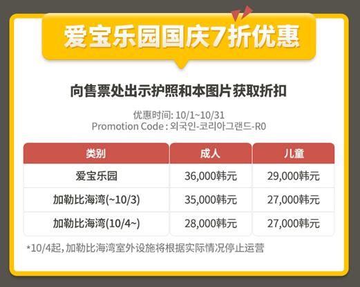 除此之外,爱宝乐园还推出了“国庆期间中国游客门票七折优惠”活动。10.1~10.31期间,访问爱宝乐园门票价格为36,000韩元,访问加勒比海湾的门票价格为28,000韩元。爱宝乐园相关负责人表示:“而随着越来越多的中国游客前来游玩,我们也在不断努力推出多样便捷的出行服务。比如说最新推出的evercab专车接送服务,专车司机将在指定区域内的任意地点把客人安全接送到爱宝乐园,除了固定资费除外将不会有任何的额外费用,并且费用里已经包含了门票费。关于专车使用等相关信息,大家可以到爱宝乐园的中文官方网站以及官方微博微信等进行了解(爱宝乐园官网内可进行预约)。希望大家多多使用,我们也将推出更多更贴心的服务。”