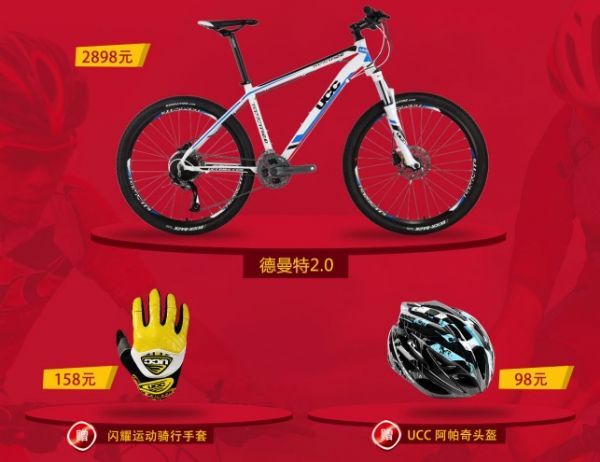 除了定金膨胀和抽奖外,UCC还把自己最擅长的促销方式搬到了自己的天猫旗舰店——那就是买赠。在今年的双十一,凡在天猫旗舰店购买UCC德曼特2.0的用户,就可获赠价值158的闪耀骑行手套和价值98的阿帕奇头盔各一!