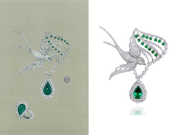 轩灵客人定制雅石·沧海一粟祖母绿两用胸针,手绘+实物