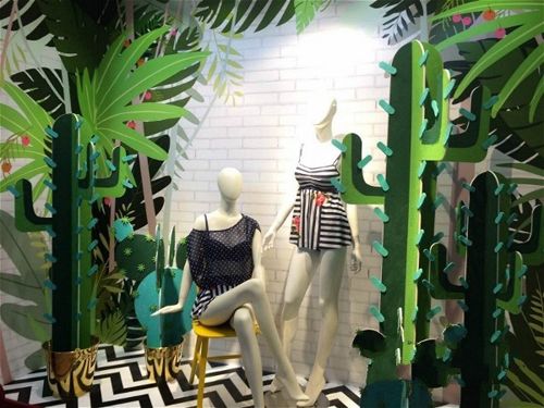 以仿真绿植及绿色环保材料打造的安莉芳“咖啡馆”异常醒目。走进生活馆,首先映入眼帘的即是简约手绘黑白相框照片墙,生动地展示了安莉芳集团40多年来的发展历程。