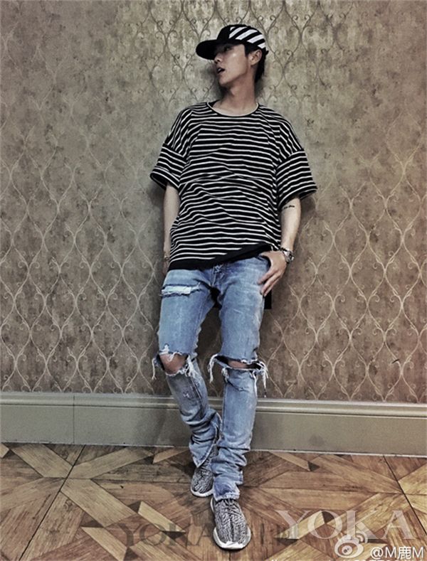 鹿晗示范:条纹五分袖T恤+破洞牛仔裤