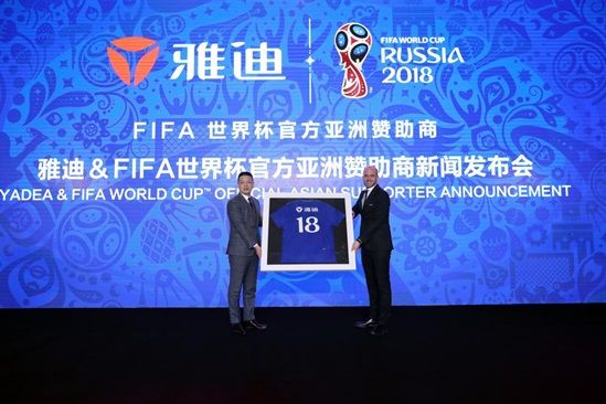 (FIFA市场战略总监Iain Dowine赠送代表2018FIFA世界杯的球衣给雅迪)