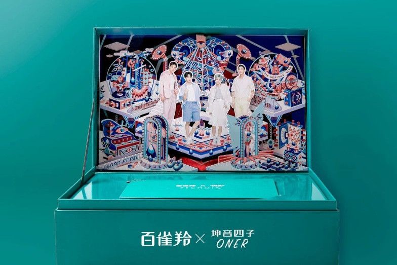 七夕的时候百雀羚联手坤音四子ONER推出了时光能量盒,礼盒上专门为坤音四子ONER打造,结合了四位成员各自的特点,和出道以来的能量故事。