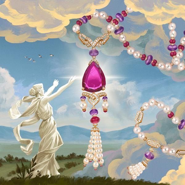 "红颜魅惑"(Lady Rubellite)长项链拥有1颗重达60.79克拉的扁平设计水滴形红碧玺,鲜艳夺目的亮粉色调闪耀热烈奔放的魅惑气质。此外,此款长项链还以密镶钻石、紫水晶和红碧玺搭配早在巴洛克时期就已广受青睐的珍珠元素。