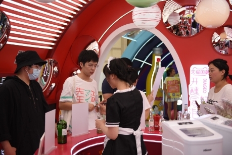 除线上的推广外,天猫国潮还携手帝亚吉欧和风林火山,在8月14日到8月16日期间,于上海中欧街举办夏日bar主题活动,并在现场以“瓶中奇遇记”为主题搭建了大型体验装置,除了独具设计感的网红打卡墙外,内设的调酒台为体验参观者现场调配定制混饮组合,让路人纷纷驻足体验。