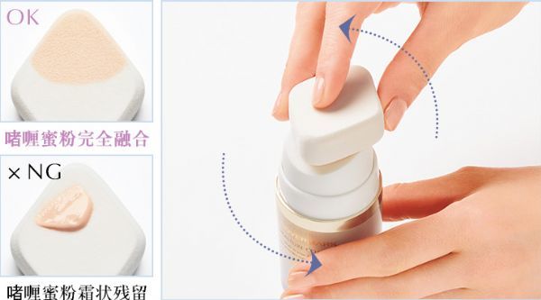 把粉扑放在容器表面,让啫喱蜜粉逐渐融入粉扑,再轻轻按压涂抹到肌肤上。