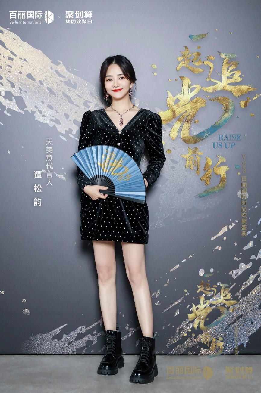 天美意代言人谭松韵,身穿复古黑丝绒裙和时下大热的马丁靴,少女感满满。
