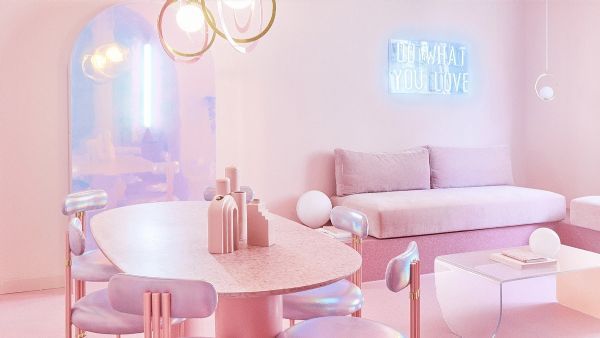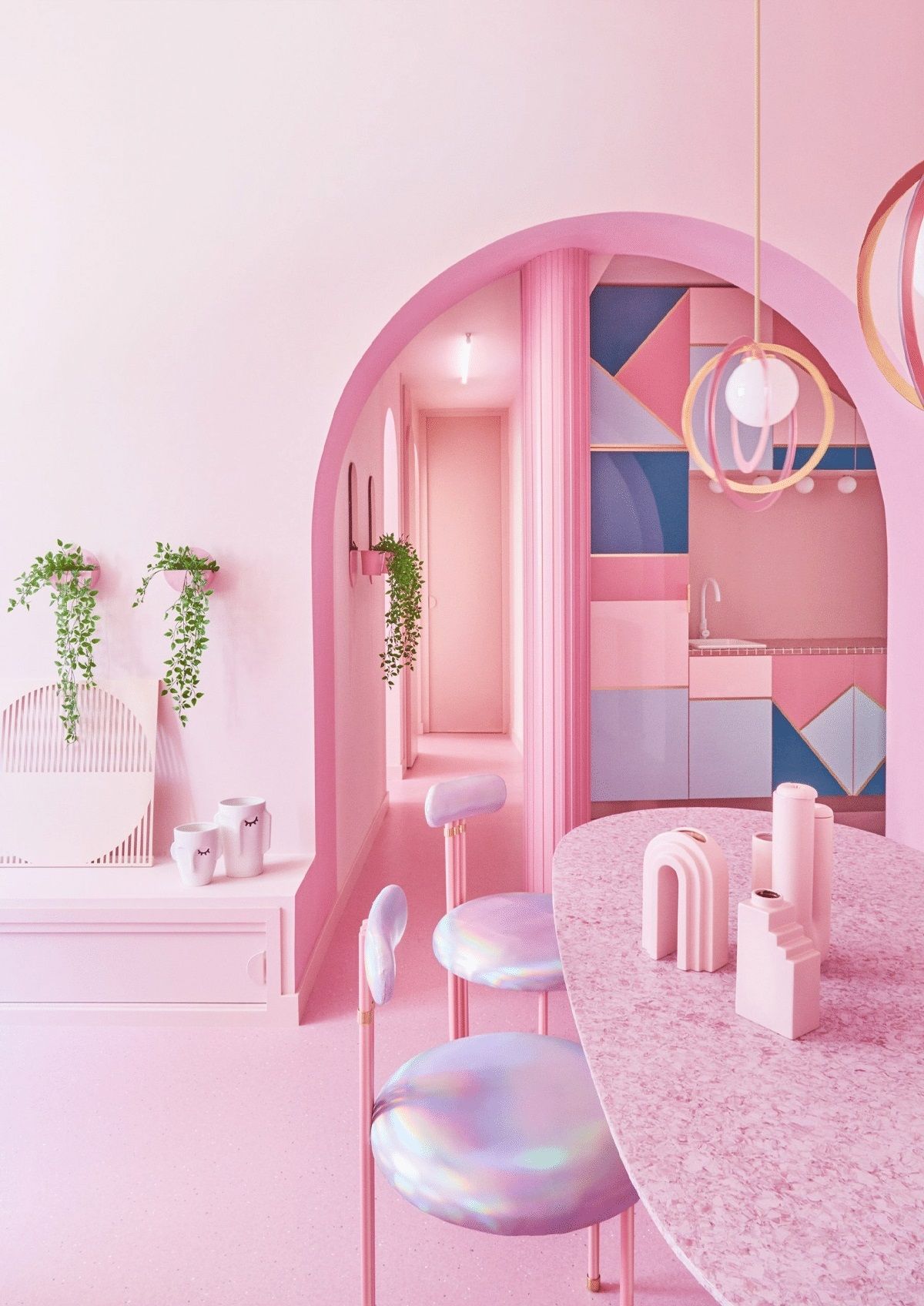 从上到下,Patricia Bustos Studios几乎是全粉红色的公寓,在美学疯狂与精心设计的组合之间取得了平衡,为您带来了难忘的度假体验。