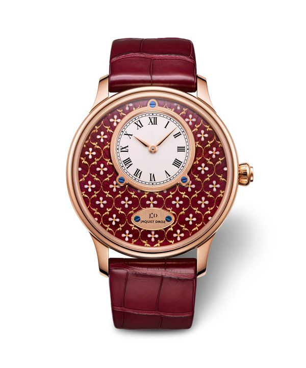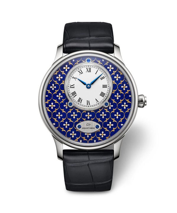 雅克德罗金箔雕花珐琅时分小针盘腕表,将来自18世纪的古董金箔叶点缀于大明火珐琅面盘之上,为这款腕表赢得「古董蕾丝」之美誉,亦成就了品牌Paillonnée珐琅工艺之秘技。