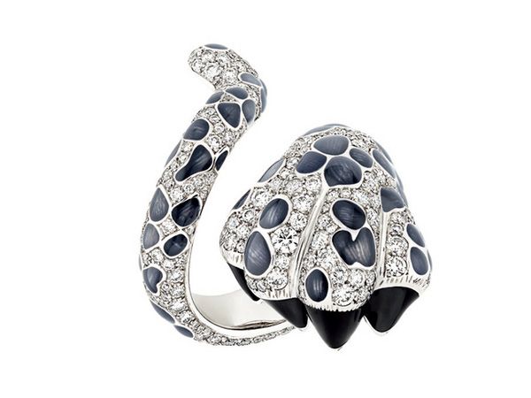 今年迎接圣诞佳节来临之际,Victoire de Castellane将漫天飞雪洒落豹爪,除了将原来的黄K金款式铺镶上钻石外,也推出精敛的白K金镶钻款式;每只戒指镶嵌4.25克拉钻石,两款分别以 灰色彩漆与巧克力色彩漆着点上豹纹,每个斑点更再刷上透明漆增加光泽与神秘感,黑色爪甲周围的金属更刻勒上沟纹以摹绘豹的指毛。