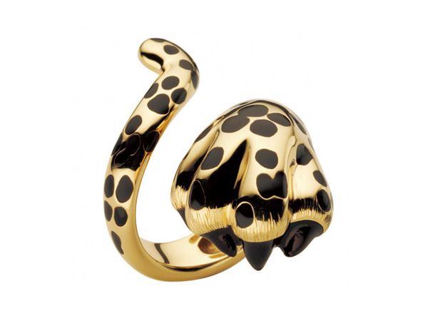 2003年,Dior 珠宝设计师Victoire de Castellane将豹纹发挥到珠宝设计上,推出造型特别的黄K金戒指,以彩漆布上讨喜的巧克力色豹纹斑点,豹爪延伸至尾巴围绕于指节如同Mitzah Bricard将豹纹围巾环系腰间,精巧的造型结合精湛工艺,在推出后一直是珠宝系列中备受欢迎的作品。