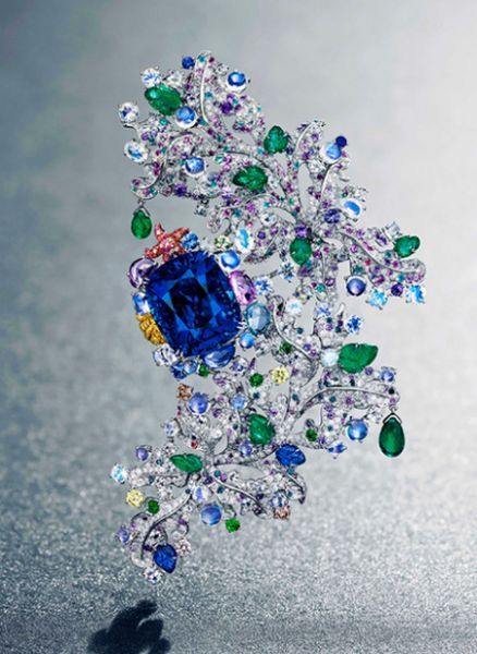 Côte d’Azur Brooch海之颂胸针收录于此次拍卖会目录封底,并以完整六页介绍,成为整场拍卖会焦点。受佳士得力邀,Anna以这颗58.29克拉举世稀有的皇室蓝宝为设计主轴,四周围绕钻石花藤,仿若海草般舞动的线条,展现Anna Hu独有的梦幻风格,并缀以月光石、粉彩刚玉、绿榴石、彩钻、雕花蓝绿宝、水滴型祖母绿,总长12.7公分,整体如皇冠般的造型,三合一体的设计,可拆解为两件不同的胸针亦或当作坠饰佩戴,吸引收藏家关注的不仅是灿烂夺目的设计,更在于精巧的工艺设计及其拥有的无限可能性。