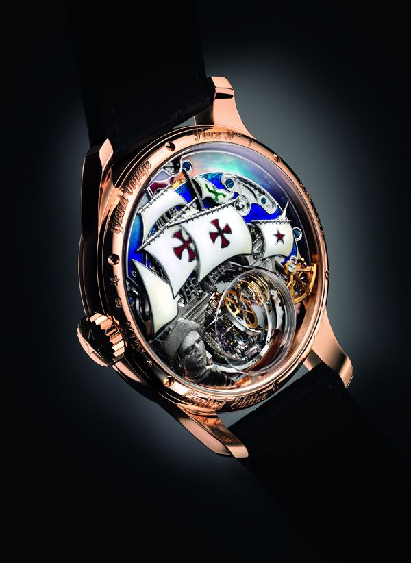 经过5年多的倾力研发工作,真力时在2010年推出了尊贵系列哥伦布高复杂腕表,首次将航海天文船钟自由摆动水平方向架移植到腕表,以此抵消地心引力对腕表走时产生的不良影响,与航海时计有异曲同工之妙。这款超复杂腕表的研发在本质上解决了时至今日依然困扰着现代腕表行业的一个关键问题:如何令仪表在持续影响其准确度的运动中实现精确的测量。以哥伦布命名不仅是向世上最伟大航海探险家致敬,也源于历史遗承,真力时早在20世纪初就制造出Lepine天文钟机芯,其擒纵机构被命名为“哥伦布擒纵机构”。这款天文钟获颁瑞士纽莎特尔天文台三项首奖和英国泰丁敦天文台 “A级证书-非常卓越” 此项发明不但展现了品牌的大胆创意,也在向品牌的历史致敬。