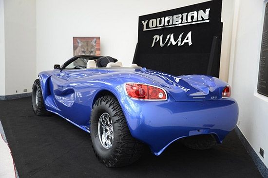 该车配备20英寸铬合金胶粘轮胎圈和44英寸的轮胎,车灯类似沃尔沃车型,尾灯则来自别克昂科雷。Puma由当地汽车制造商所制,是为了“敢与众不同的人”所造。丑陋的车身据说由铝和纤维玻璃部件制造,还配备了可折叠硬蓬。
