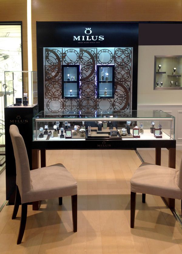 全新的品牌授权专柜设计贯彻美利时(Milus)优雅而夺目的设计美学,以黑色为主调,彰显品牌高贵典雅的特质。展示柜设计独具创意,融合品牌腕表系列表盘的镂空时符构成独特的图案,吸引万千注目。