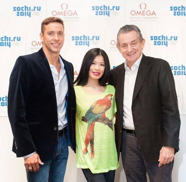 (从左至右)泳坛名将克洛斯、奥运选手陈美、欧米茄全球总裁欧科华