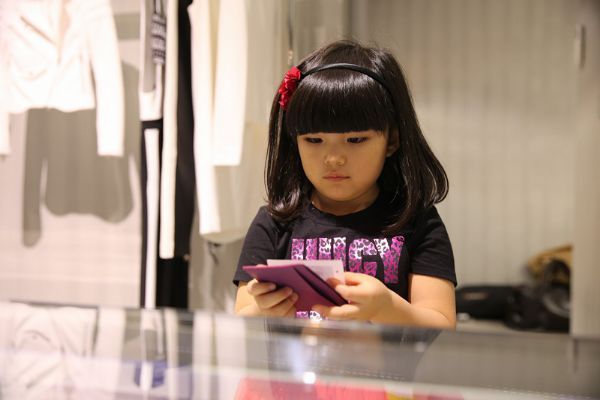 当看到玻璃柜台里的皮质名片信用卡夹时,Angela示意店员拿出来看看,举手投足间颇有些小掌柜的派头。看来不管去哪儿,Angela都不忘犒劳辛苦的老爸。Angela还有模有样地跟店员讨价还价,我们不禁感慨,Angela,你讨价还价的功力比王导要强哦!