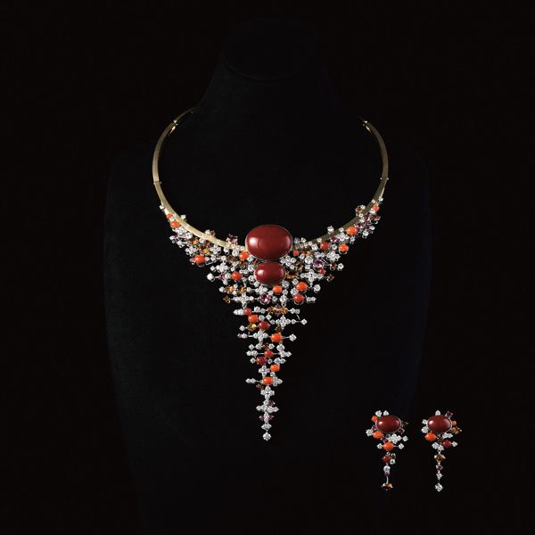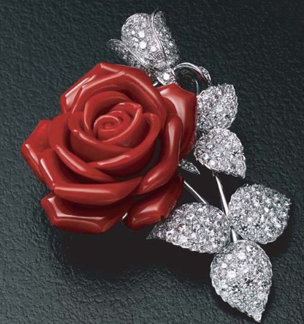 珊瑚雕刻配以钻石,梦幻而美丽的玫瑰,绽放永恒之美。 材料:血红珊瑚/白金/钻石/红宝石