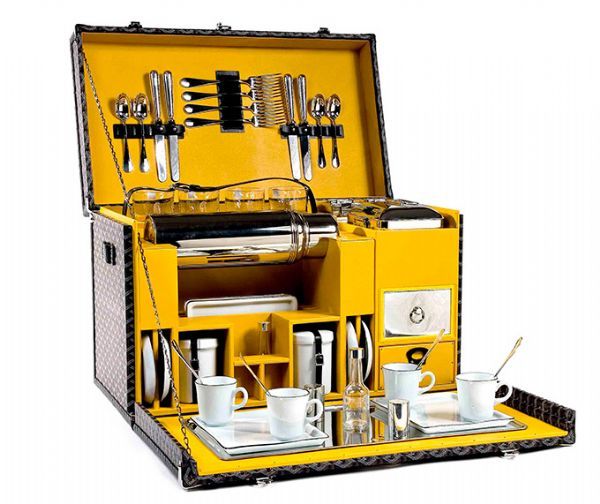 Goyard 野餐箱,各种器具的收藏布局、恰到好处,充分利用了箱子内部空间的各个细节,几乎可以囊括野餐所需的所有小器具,将这生活艺术装进旅行箱。