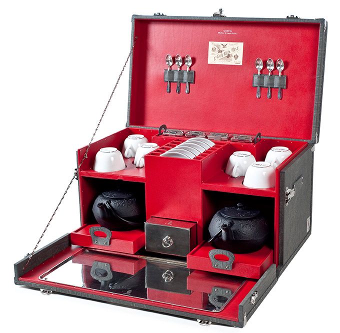 Goyard 茶具箱,红砖灰瓦带来的浓郁中国风将茶文化带到传统而又包容的欧洲,中国红茶从来都是贵族饮品的首选,其复杂的冲泡工序被装进一个小巧的旅行箱中,打造它的工匠可谓是费尽心思。