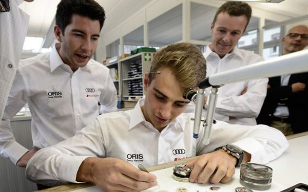 中国名品时尚网综合报道:趁着季前测试赛的休息时间,奥迪车队的三位车手——两届勒芒赛冠军Marcel Fässler,本届德国房车大师赛(DTM)冠军Mike Rockenfeller以及DTM新手Nico Müller参观了瑞士独立机械制表品牌ORIS豪利时位于瑞士Hölstein的制作工厂,并亲身体验了制表过程。