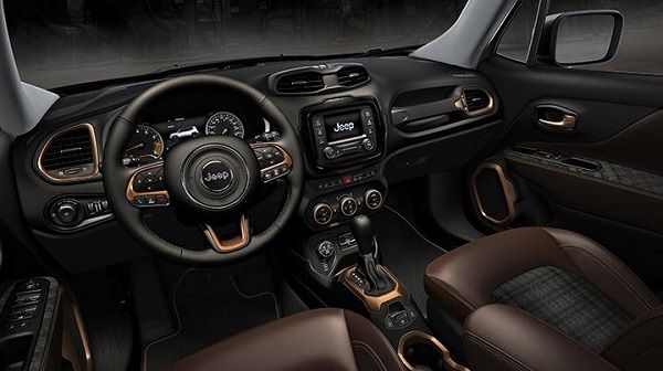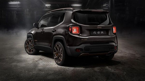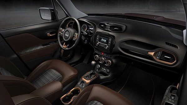 为了拉拢中国消费者,Renegade Zi You Xia Concept以北京国家表演艺术中心作为车色灵感,采用两种暖色调的对比色,在车漆部分以暖调的巧克力灰(Warm Chocolate Gray )搭配用于水箱罩外框、雾灯灯座、20吋轮圈、车顶行李架、车身铭牌、后保杆护板等细节的氧化深铜色(Dark Anodized Bronze ),两色看似互相冲突,但其实画面毫无违和感。