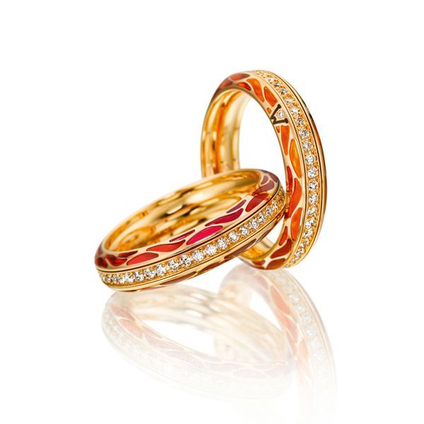 喜悦的心情,犹如雨后灿烂的阳光,那一瞬间的欢愉,仿佛绚丽的彩虹在心底照耀出五颜六色的光芒。华洛芙“真正的喜悦—珊瑚橙”指环,首次采用特殊设 计方式:精湛高超的技术传承了华洛芙家族一贯的坚持,彩色的冷珐琅赋予指环绚丽的外观,同时让指环更加灵动活泼,每一次全新的审视都会带给你意想不到的惊 喜。“真正的喜悦—珊瑚橙”指环由两个18k黄金的独立指环共同组成,外层的指环上是绚丽的冷珐琅,内层的指环上镶嵌一圈耀眼的钻石,使整个指环闪亮明 媚,熠熠生辉。当指环中间的钻石在指尖飞舞转动的时候,好似将母亲喜悦快乐的瞬间铭记在心,闪亮一生。