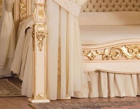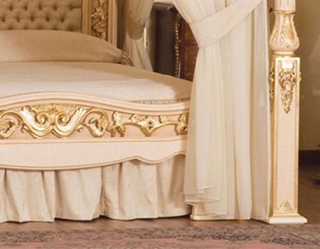 整个床体用栗木雕刻,华盖采用樱桃木为材料,各个细节处使用了107千克的黄金装饰,并且在床头板处镶嵌有钻石及其他不同宝石。