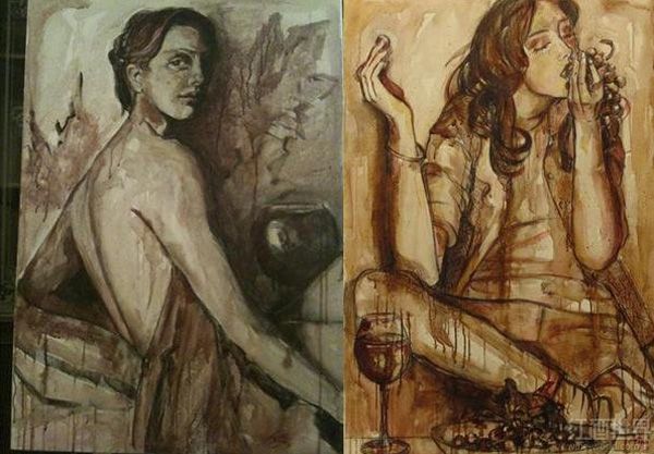 一个世纪前,英国作家奥斯卡·王尔德(Oscar Wilde)笔下刻画的道林·格雷肖像(the picture of Dorian Gray)似乎带有使主人公沉沦堕落的魔力。一个世纪之后,一位意大利画家使用白葡萄酒和红葡萄酒在帆布上作画,不添加其他任何化学颜料,仅使用水和面粉固定颜色。她的画作会随着时间变色,展现出与葡萄酒在瓶中熟化过程类似的色彩渐变现象。不仅如此,“葡萄酒在酒瓶中熟化需要花费数年时间,而在帆布上仅几个月就完成了”。Elisabetta作品的颜色会由最初的紫红色逐渐变成鲜红色,最终发展成琥珀色、橙黄色和棕色。她喜欢在作品中展现各种女性性感迷人的风采,不仅陶醉了看画的人,更为我们展示出葡萄酒的另类风情。