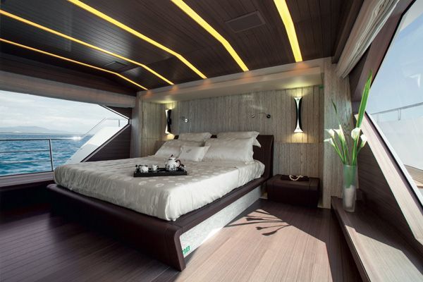 三层甲板为乘客提供更加宽敞的生活空间,而且为客人设立独立的空间,保证其隐私。尤为值得一提的是,主甲板全景玻璃增加了光线的照射面积,让人畅享海上悠闲的生活。驾驶舱大面积的玻璃则使舵手可以获得180度的开阔视野。5间卧室可以接待10位客人,其中主人套房位于主甲板,而4间客卧则位于下层甲板。
