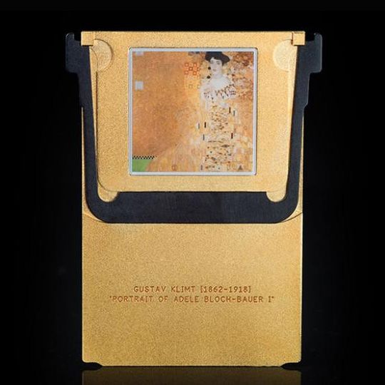 Mobiado新推出的这款致敬克里姆特版奢华智能手机外壳为黄铜材质,镀以24K黄金,以呼应克里姆特许多名作的主色调(克里姆特的巅峰时期也被称为“金色时期”,在此时期他的画作中经常可见夺目的金色,甚至直接使用金箔)。但其最令人惊喜之处在外壳之下:在手机电池盖内侧绘有微缩版的克里姆特名作《阿德勒·布洛赫-鲍尔夫人肖像之一》,这幅画也颇为符合Mobiado奢侈品的定位——它上一次露面是2006年在拍卖会上拍出了1.35亿美元的天价。